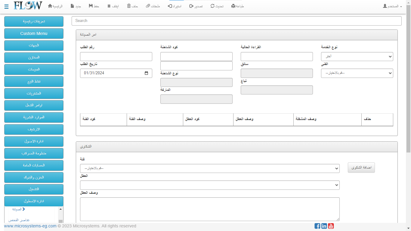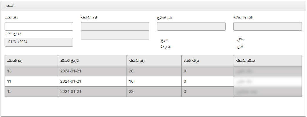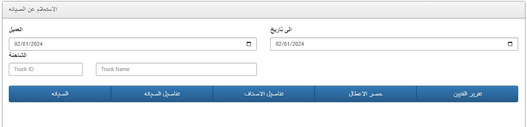 ومن شاشة امر الصيانة عند ادخال كود الشاحنة يظهر جميع التفاصيل الخاصة بالشاحنة و يظهر الفحوصات اللازمة عند الاستلام الشاحنة و تحديد نوع الخدمة (صيانة دورية ام طارئة) وتحديد الفني و عند الفحص يمكن اضافة شكاوي للشاحنة.