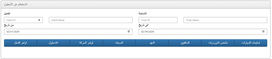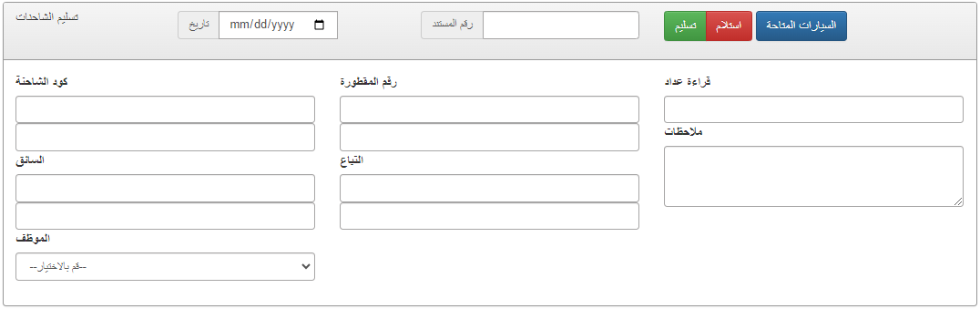 ومن شاشة تسليم الشاحنات بيتم تسليم و استلام الشاحنات لسائقين وعرض الشاحنات المتاحة لتسليم.