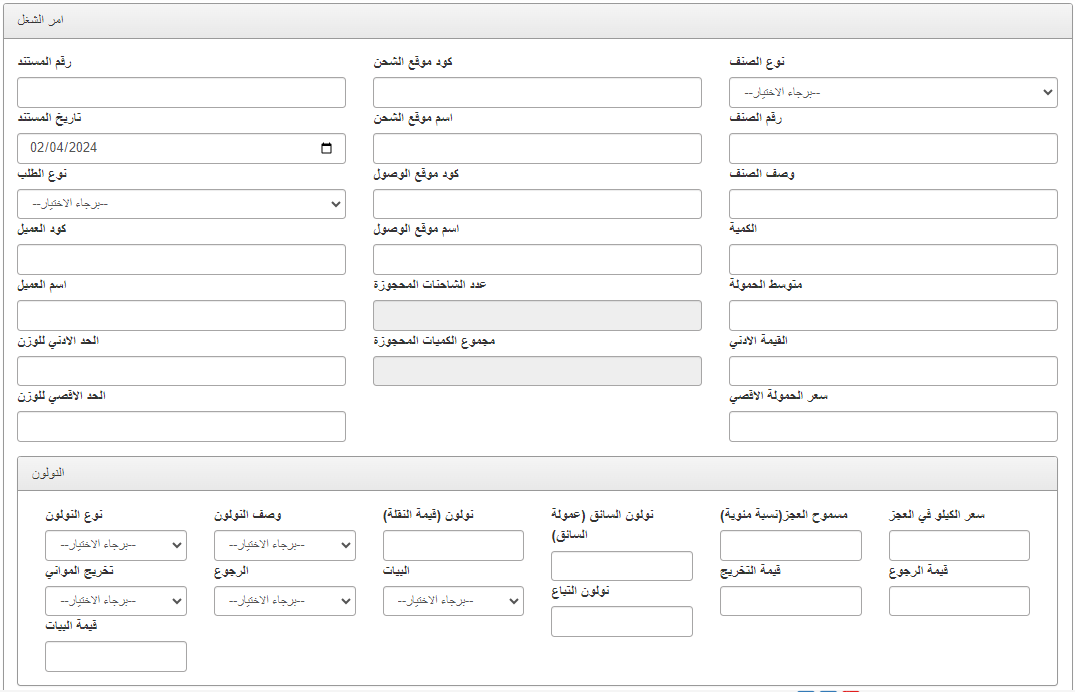 ومن شاشة اوامر الشغل بيتم ادخال تفاصيل امر الشغل وتحديد النولون الخاص بالسائق.