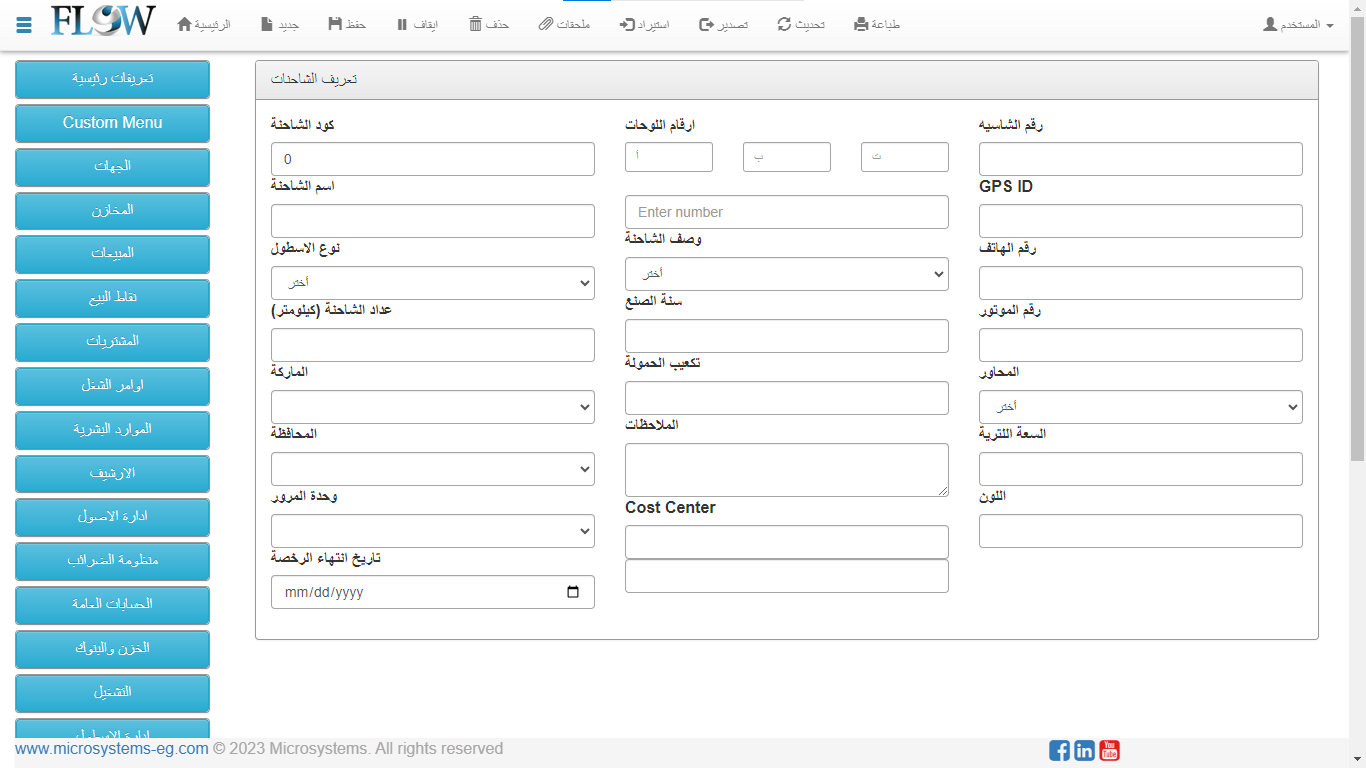رقم الموتور، المحاور، السعة اللترية، اللون، مركز التكلفة، GPS ID ).