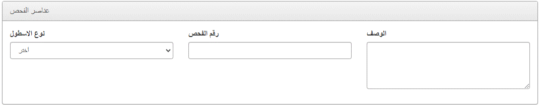 ومن شاشة عناصر الفحص بيتم تعريف عناصر فحص الصيانة الاساسية لكل نوع اسطول عن طريق اختيار نوع الاسطول و تحديد كود للفحص و ادخال اسم الفحص.