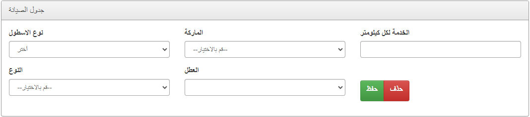 ومن شاشة جدول الصيانة بيتم تحديد الصيانة الدورية للشاحنات عن طريق اختيار نوع الاسطول و الماركة و نوع العطل و عدد الكيلومترات المحدد لاتمام الصيانة.